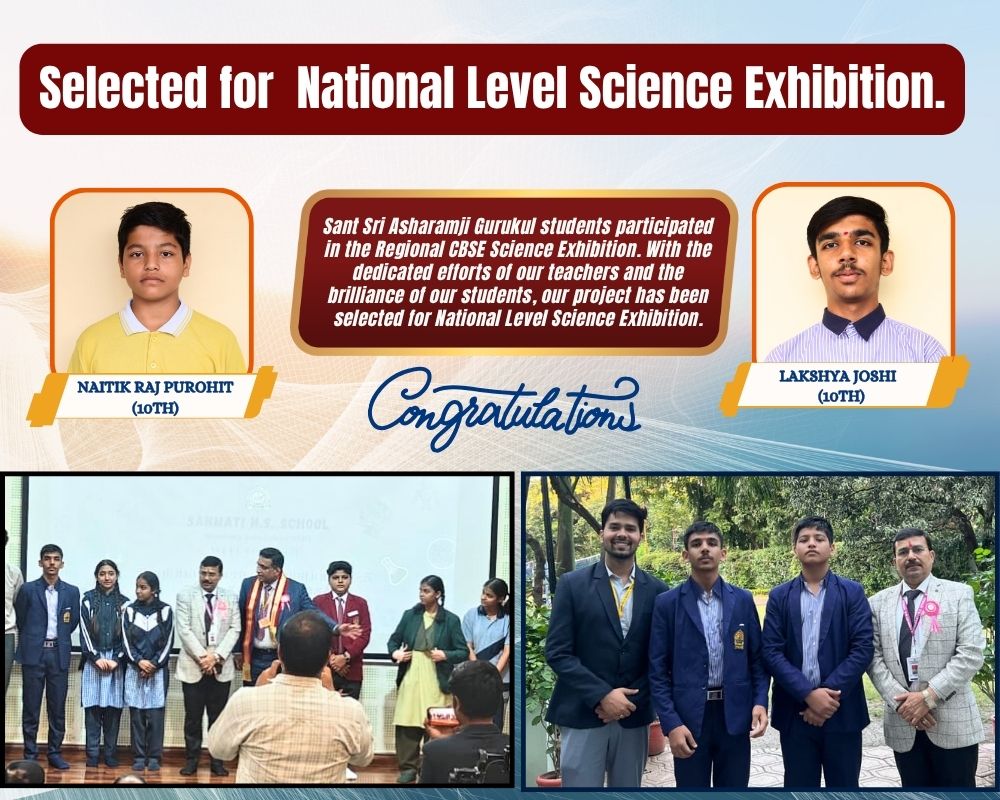 Sant Sri Asharamji Gurukul students participated in the Regional CBSE Science Exhibition. With the dedicated efforts of our teachers and the brilliance of our students, our project has been selected for National Level Science Exhibition.